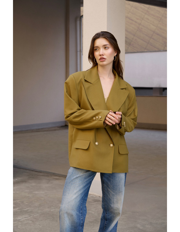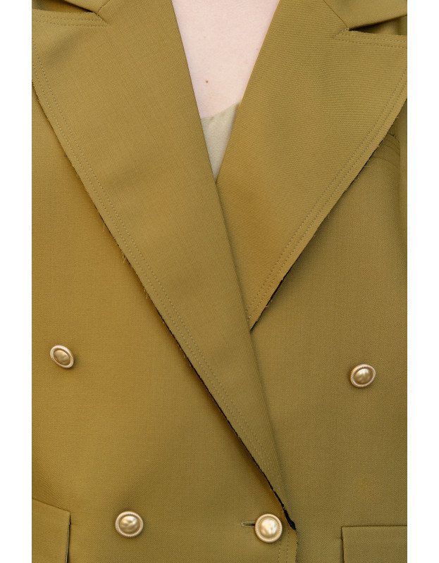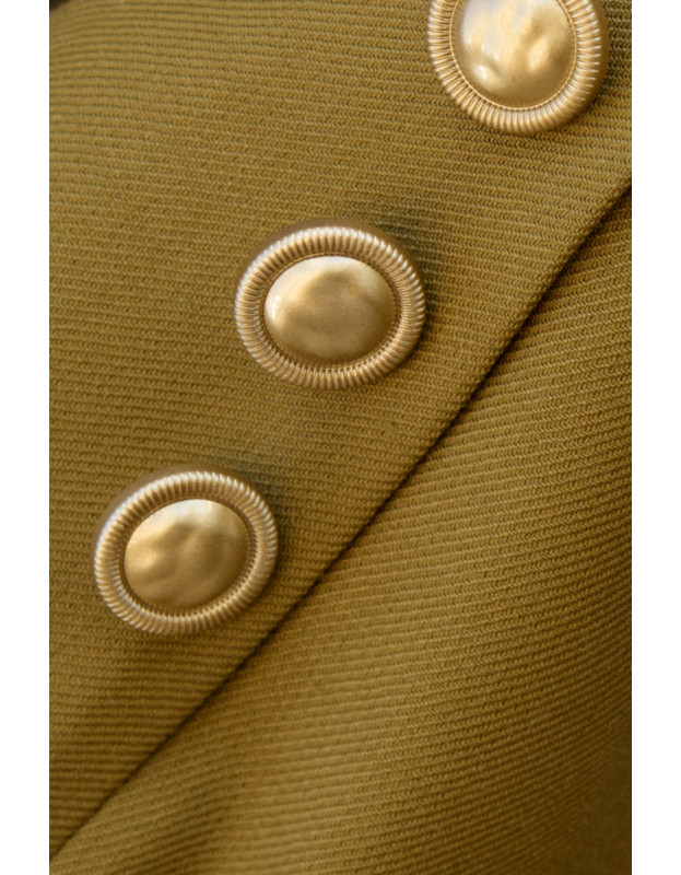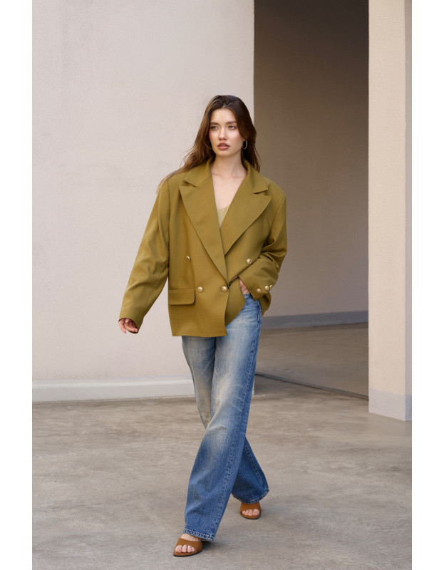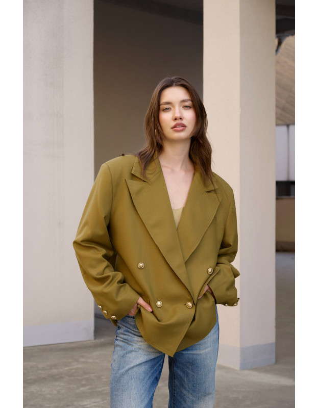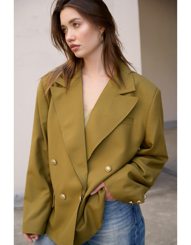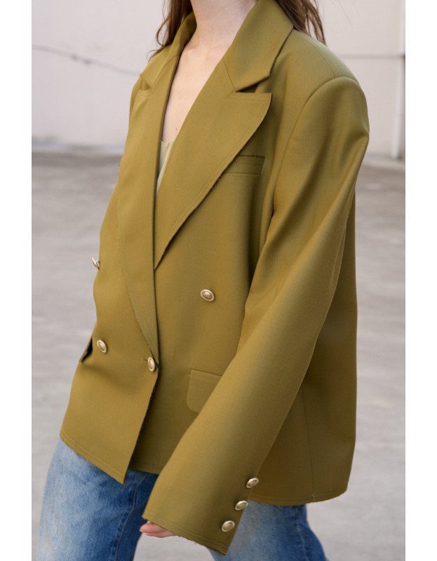 Это не просто жакет — это заявление! Глубокий оливковый цвет, который идет абсолютно всем, дополнен главными деталями сезона: дерзкими необработанными краями и выразительными акцентными пуговицами.