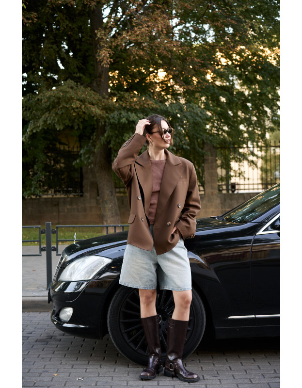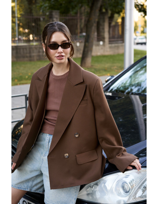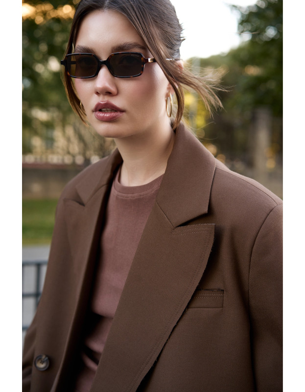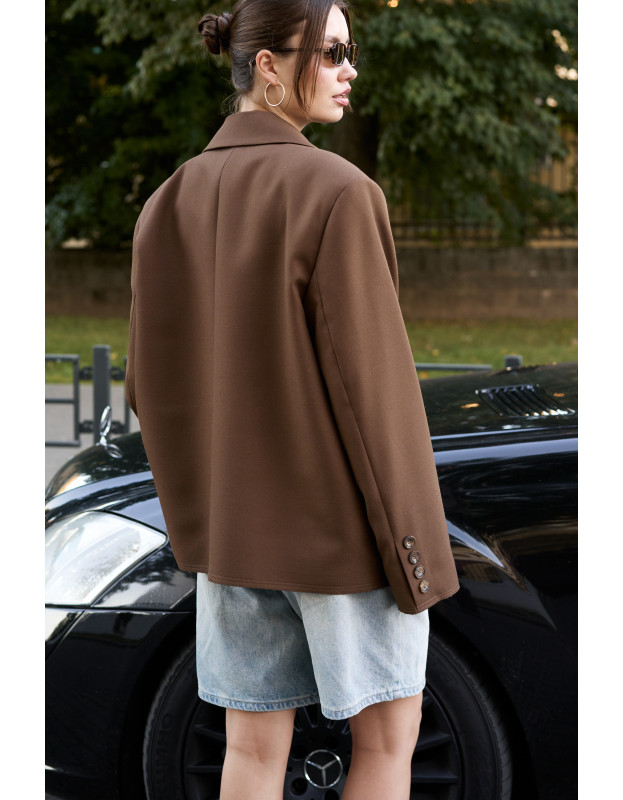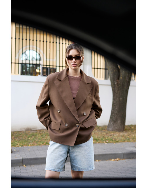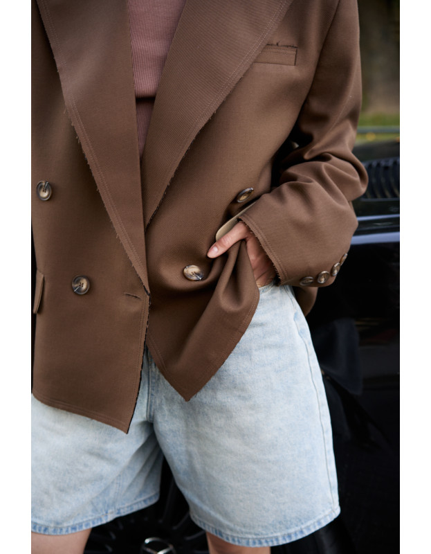 Классика, переосмысленная в духе современной эстетики. Глубокий и насыщенный шоколадный цвет добавляет образу статусности и тепла, а эффектные необработанные края придают строгому двубортному силуэту дерзкую небрежность и авторский характер.