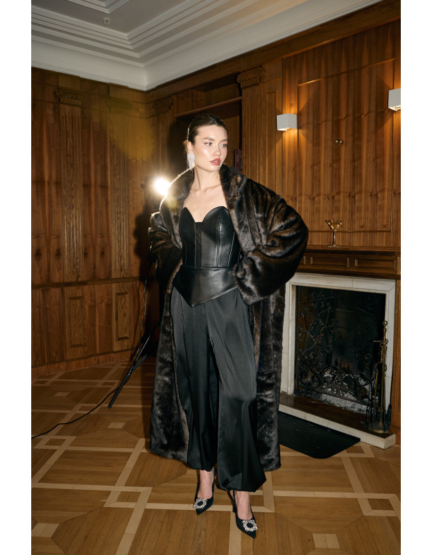 Алладины NY черные — широкие брюки из мягкого атласа. Свободная и комфортная модель для праздничного образа. Идеально сочетаются с жакетами, облегающими топами и новым корсетом из эко-кожи.