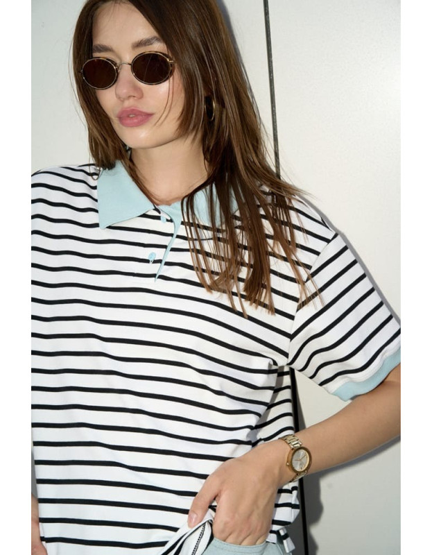Футболка Polo c актуальной полоской, которая послужит вам не один сезон. Изюминку футболке добавляет акцентный голубой воротник.