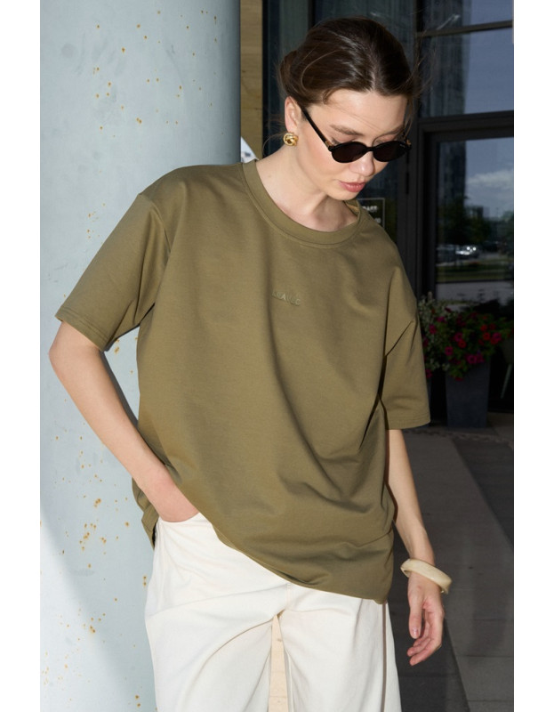 Базовая оверсайз футболка с резиновым лого KRAVEC красивого оливкового оттенка.