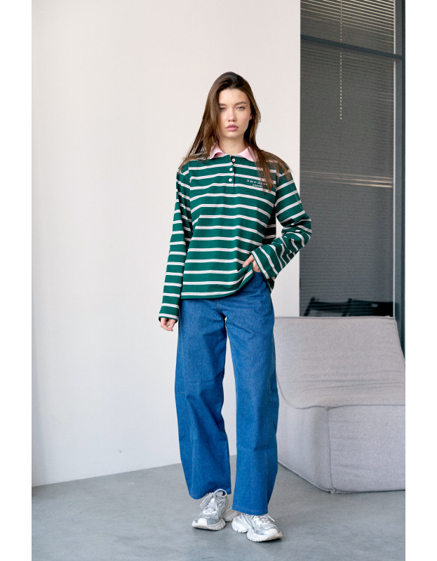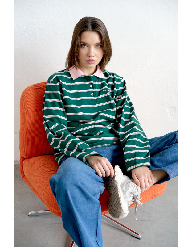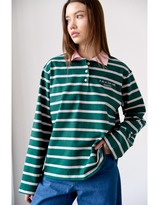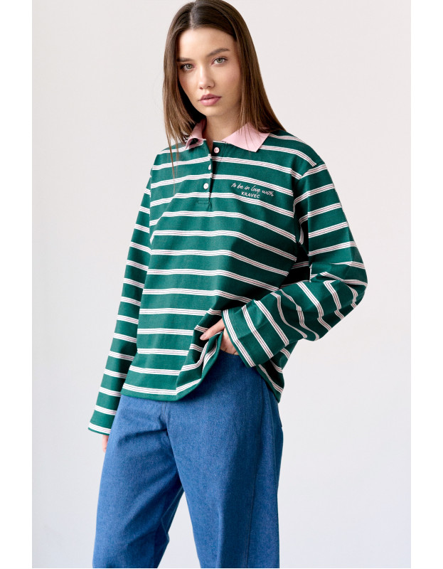 Зеленый лонг POLO в полоску, которое сложно не заметить! Розовый воротничок — это та самая деталь, которая создает контраст. Свободный край, модный силуэт, яркий акцент.