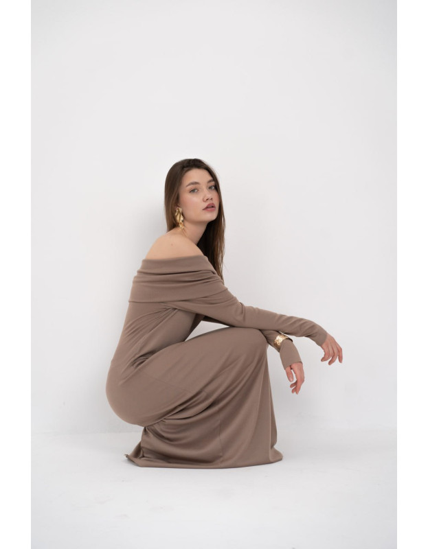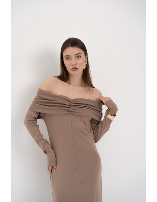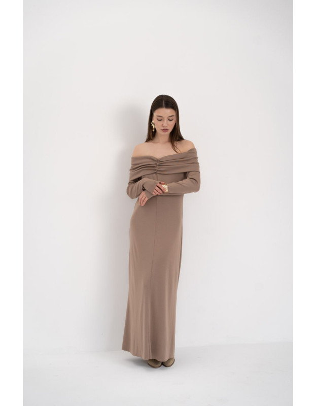 Полуприлегающий силуэт и открытые плечи — женственность и элегантность в чистом виде.