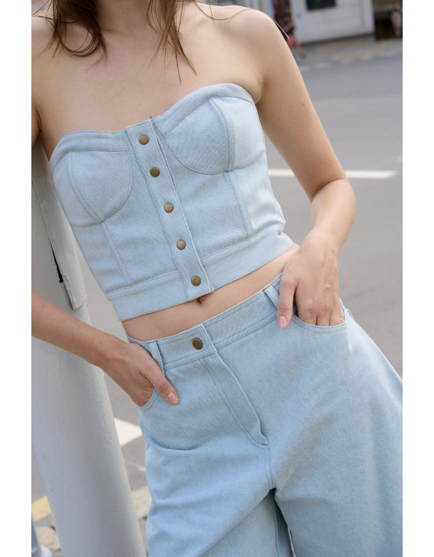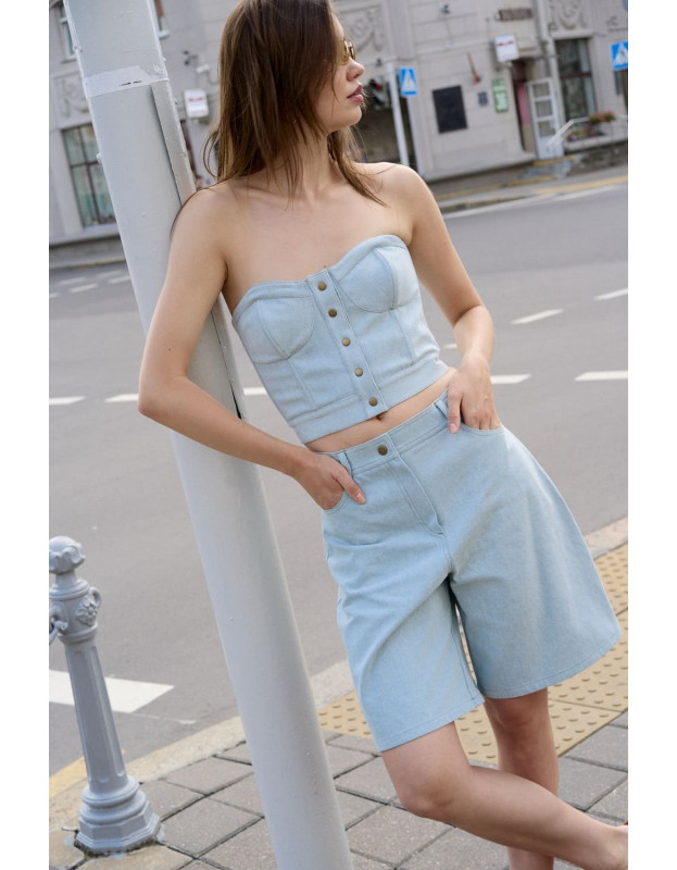Классические бермуды из деним в нежно светло-голубом оттенке. Данный оттенок создает винтажный эффект, а прямой крой, удобная посадка и универсальный дизайн делают их идеальными для летнего образа. Отлично сочетаются с футболками, рубашками, топами. А также могут быть дополнены корсетом в том же оттенке.