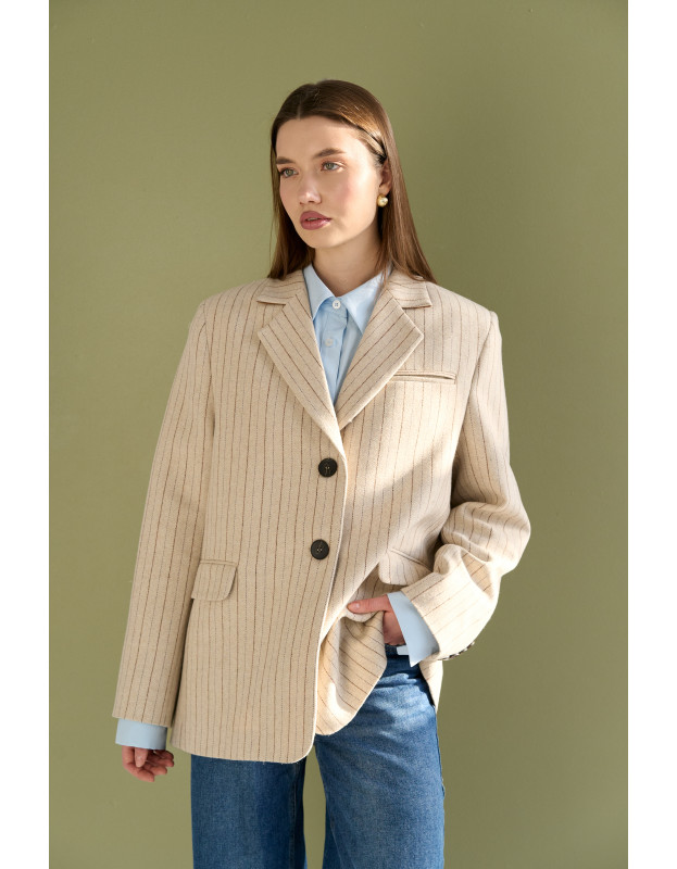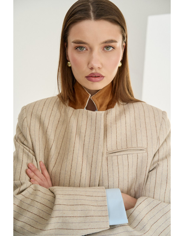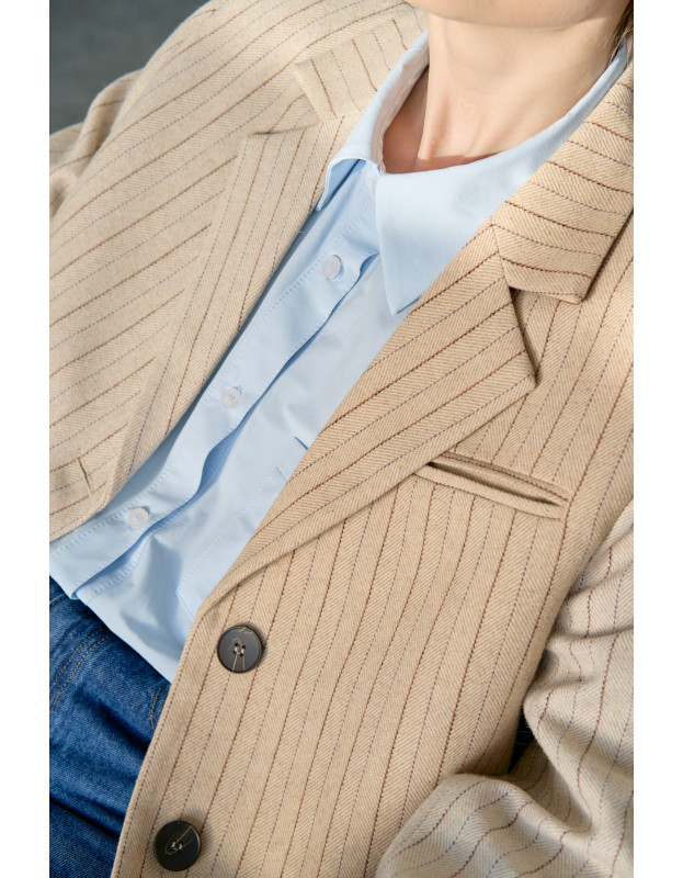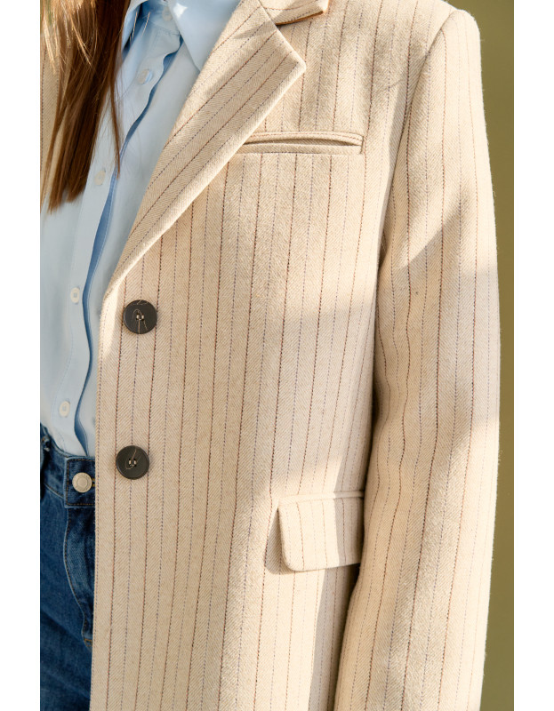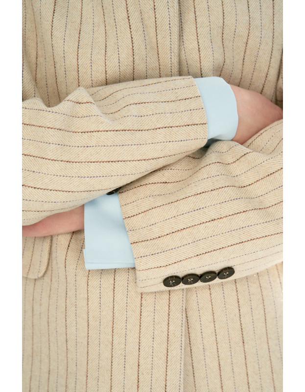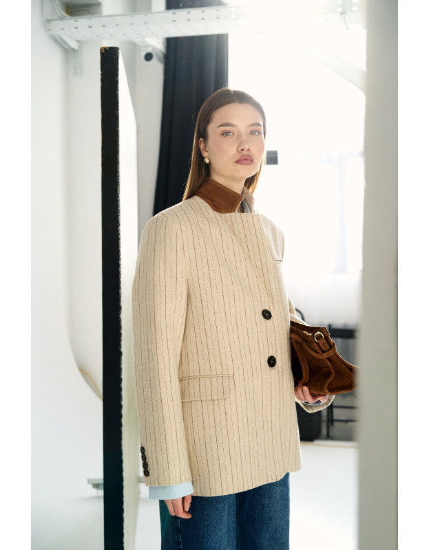 Лимитированный выпуск! Классический крой жакета выполнен из высококачественной шерсти в тонкую полоску, что создает строгий силуэт. Но мягкости этому жакету добавляет цвет полоски и мягкий бархатный воротник терракотового цвета. Эти детали добавляют образу контрастности и тактильной глубины. С помощью этого жакета можно создать стильный smart casual образ.