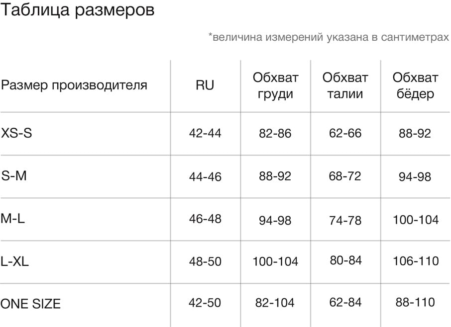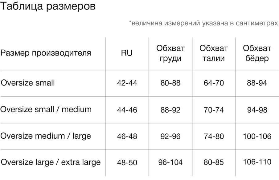 Таблица размеров