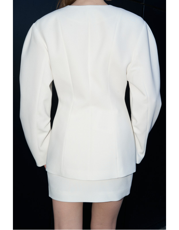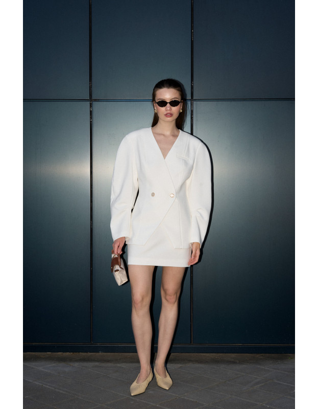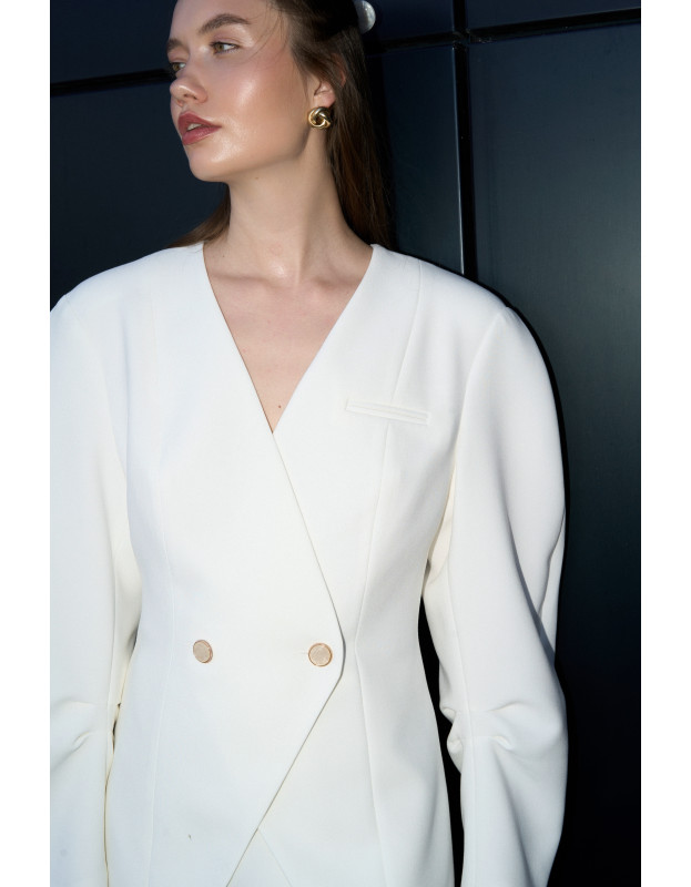 Жакет Oui Jacket молочный с двумя акцентными пуговицами О-силуэта. Рукав реглан это достоинство данного жакета так как он идеально балансирует фигуру любого типа.